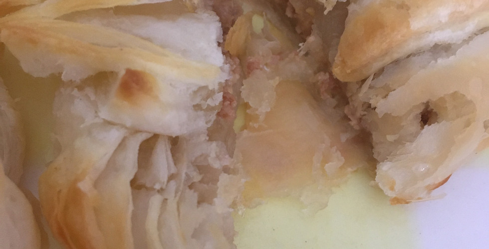 4- Pincelar ligeiramente com metade da manteiga derretida. Colocar um pouco do recheio ao longo de um dos lados mais pequenos, dobrar a massa por cima do recheio, fechar as extremidades para que o recheio não saia e continuar a enrolar como um charuto.